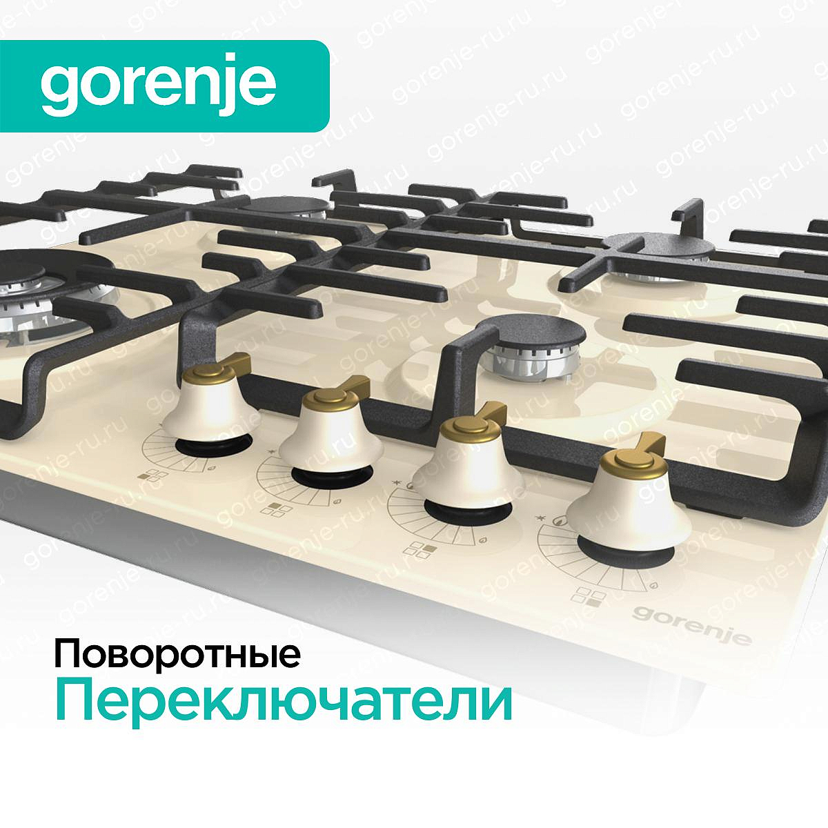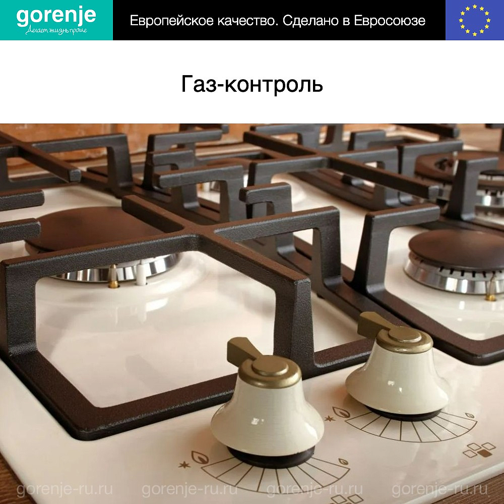 Варочная панель Gorenje GW6D42CLI выполнена в цвете слоновой кости и бронзы с добавлением чёрного. Им служат чугунные решётки. Они имеют затейливую форму, но при этом идеально гладкие, поэтому надёжно удержат всю кухонную утварь. Кроме того, они не деформируются от воздействия огня. Безопасность играет для фирмы немалую роль, поэтому в поворотные регуляторы встроена система автоматического электроподжига. Так вы избежите взаимодействия с открытым пламенем. Если вдруг оно потухнет, то в течение 5 секунд сработает система газ-контроля. Она перекроет подачу газа к конфорке. Так вы избежите утечки и отравления.