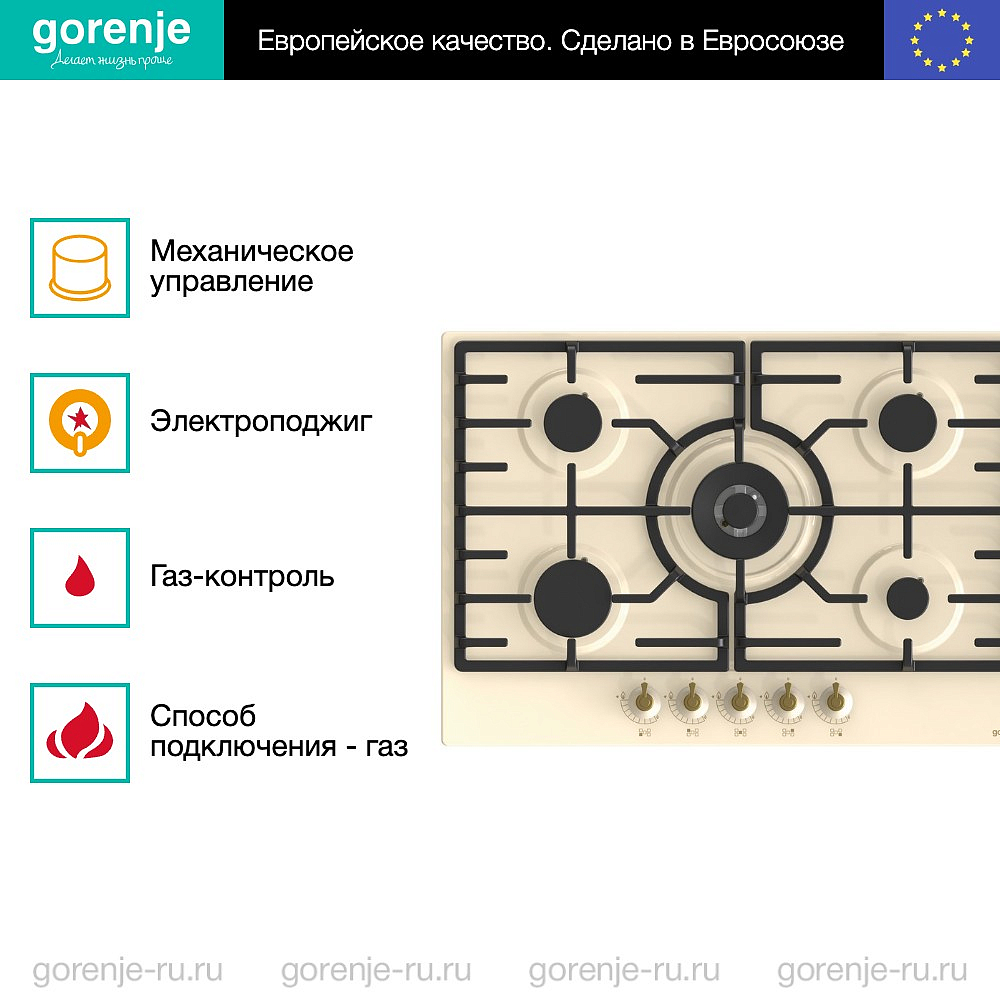 Независимая газовая варочная панель Gorenje GW7C51CLI подойдёт тем, кто ценит как внешний вид, так и отличную функциональность. Её ширина составляет целых 75 см, а сами горелки расположены настолько грамотно, что вы сможете задействовать все зоны нагрева одновременно. Дизайн прибора относится к коллекции Classico. Несмотря на общий ретро-стиль, она так названа из-за приверженности к классическому подходу в приготовлении пищи. Цвет слоновой кости удачно дополняется фурнитурой под бронзу, а также чёрными держателями.