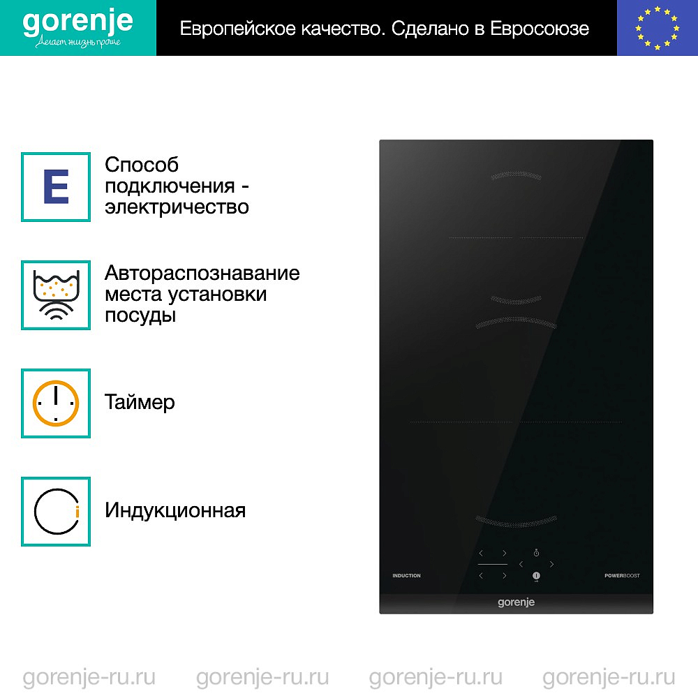 Независимая индукционная варочная панель Горенье GI3201BC оснащена двумя конфорками с функцией PowerBoost. Она сокращает время нагрева до 20% и при этом увеличивает мощность работы на 50% на короткий срок. Это значительно ускоряет процесс приготовления. С автораспознаванием места установки посуды жар автоматически включится на нужной конфорке. Управление полностью электронное. На сенсорной панели можно выбрать мощность нагрева, которая вам нужна, и установить таймер, который подаст звуковой сигнал по истечении выбранного вами времени.