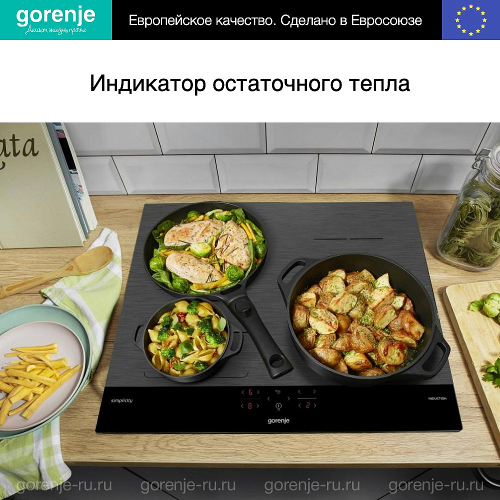 Индикатор остаточного тепла показывает, какие зоны нагрева остаются горячими после использования. Это повышает безопасность, предотвращая случайные ожоги, и позволяет эффективно использовать остаточное тепло для поддержания температуры блюд. Индикатор также способствует экономии энергии, поскольку показывает, когда можно продолжить готовить на оставшемся тепле.