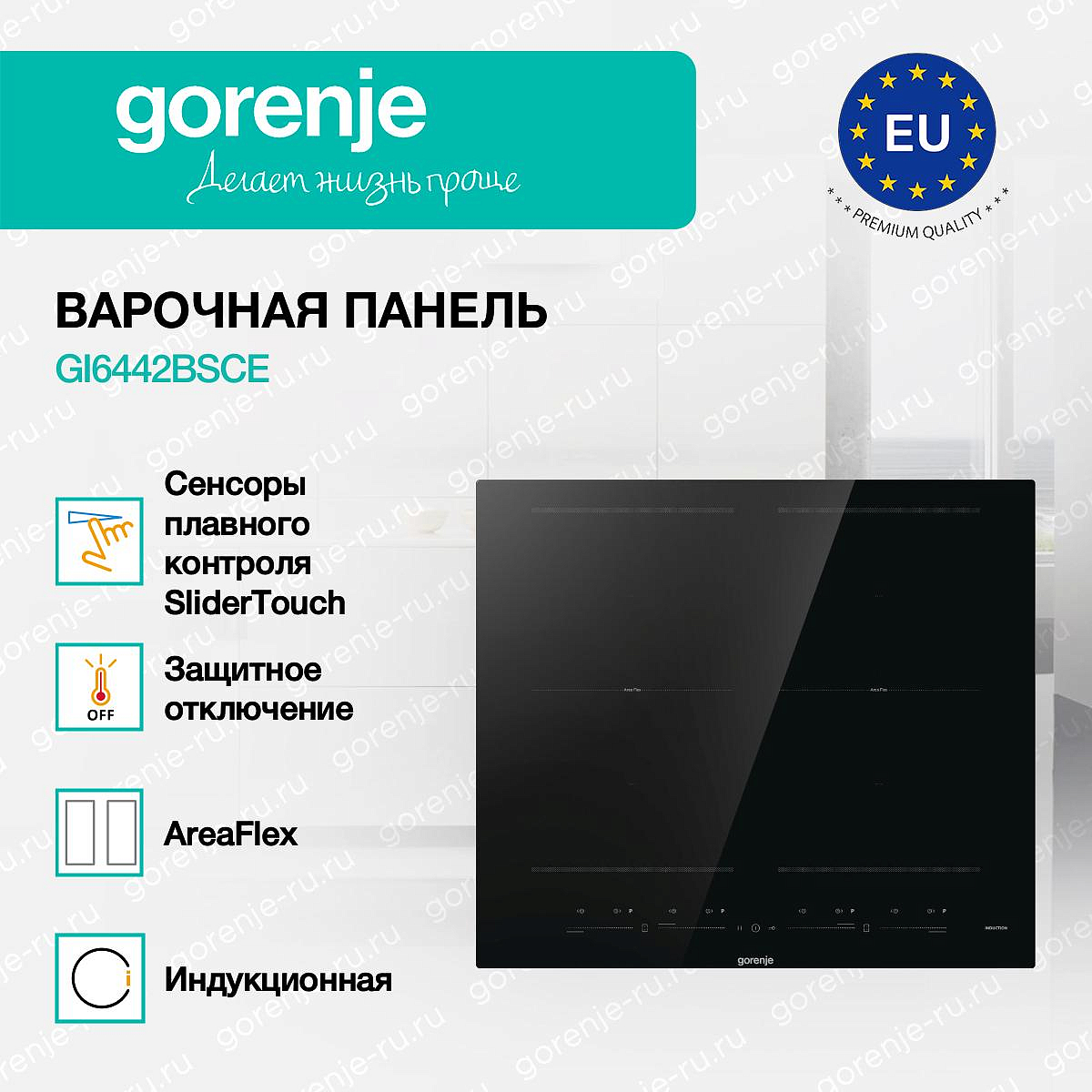 ** Все информационные материалы, представленные на Сайте, носят справочный характер и не могут в полной мере передавать достоверную информацию о свойствах, комплектации и характеристиках товара, включая цвета, размеры и формы. Фирма-производитель оставляет за собой право на внесение изменений в конструкцию, дизайн и комплектацию товара без предварительного уведомления. Перед оформлением Заказа Покупатель должен обратиться к Продавцу для уточнения свойств и характеристик Товара. Подробная информация о товаре указывается в инструкции и на упаковке товара. Используемое название в России: Горенье GI6442BSCE