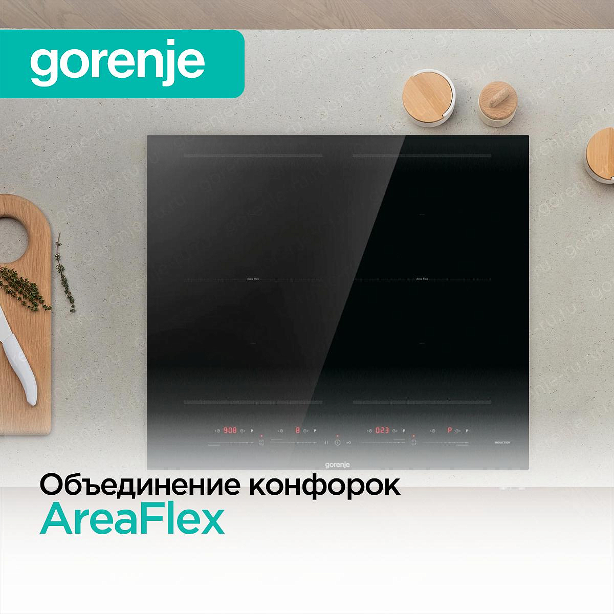 Особенностью прибора является функция объединения конфорок AreaFlex, которая позволяет объединить две соседствующие конфорки в одну прямоугольную зону. Это идеально подходит для использования посуды с овальным или прямоугольным дном, расширяя возможности приготовления пищи.