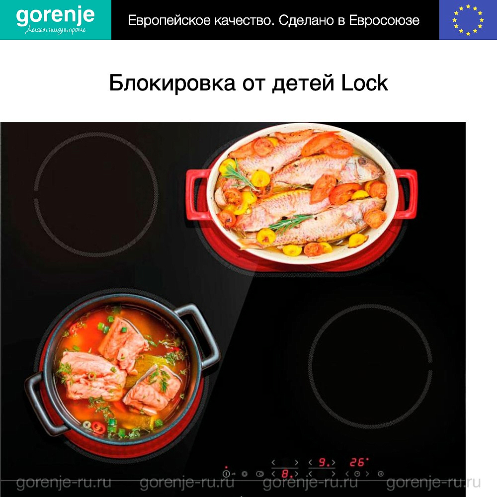 Для безопасности использования предусмотрена блокировка от детей Lock, которая предотвращает случайное включение. Индикатор остаточного тепла для каждой конфорки показывает, какие зоны остаются горячими после использования. Это помогает избежать случайных ожогов и позволяет эффективно использовать остаточное тепло.