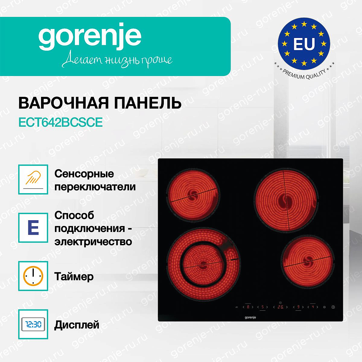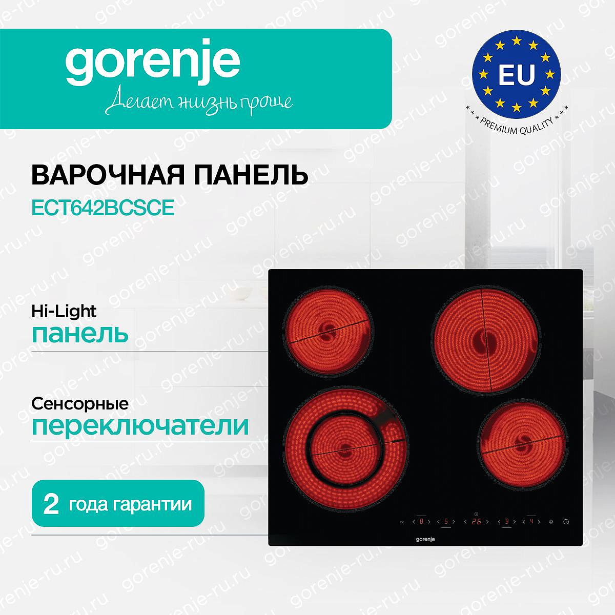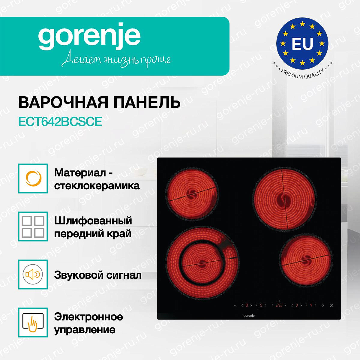 ** Все информационные материалы, представленные на Сайте, носят справочный характер и не могут в полной мере передавать достоверную информацию о свойствах, комплектации и характеристиках товара, включая цвета, размеры и формы. Фирма-производитель оставляет за собой право на внесение изменений в конструкцию, дизайн и комплектацию товара без предварительного уведомления. Перед оформлением Заказа Покупатель должен обратиться к Продавцу для уточнения свойств и характеристик Товара. Подробная информация о товаре указывается в инструкции и на упаковке товара. Используемое название в России: Горенье ECT642BCSCE