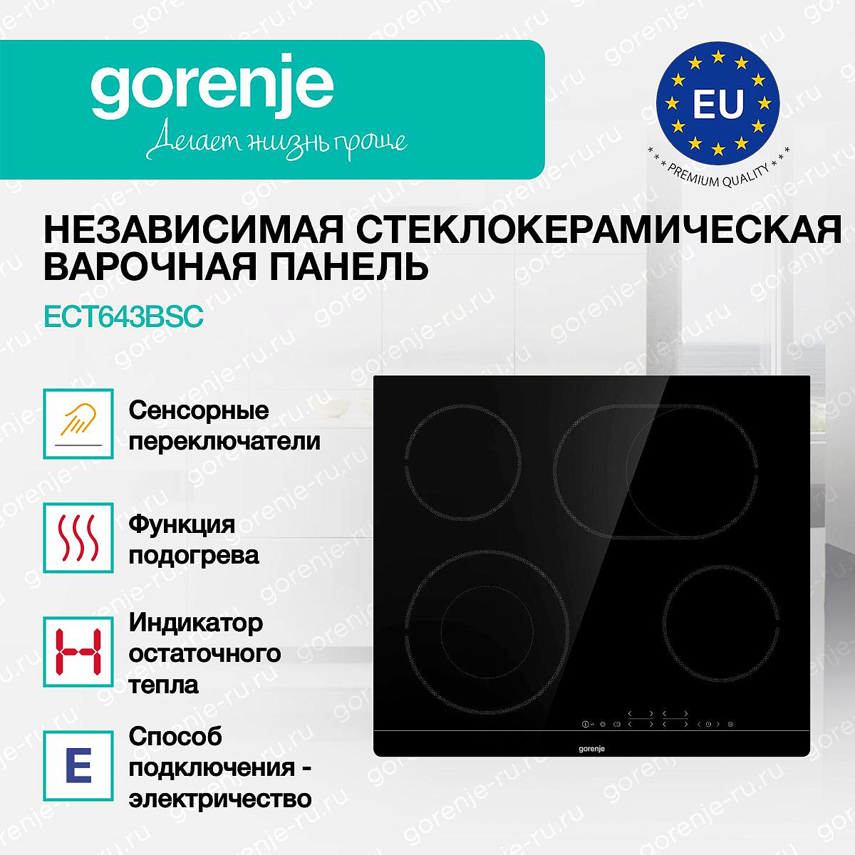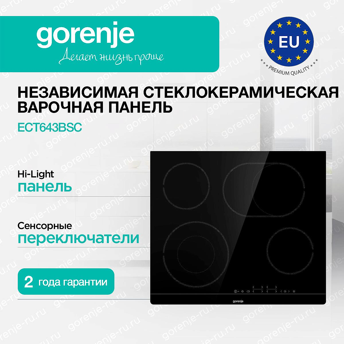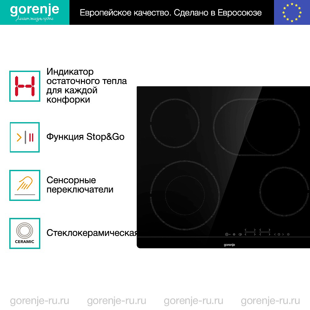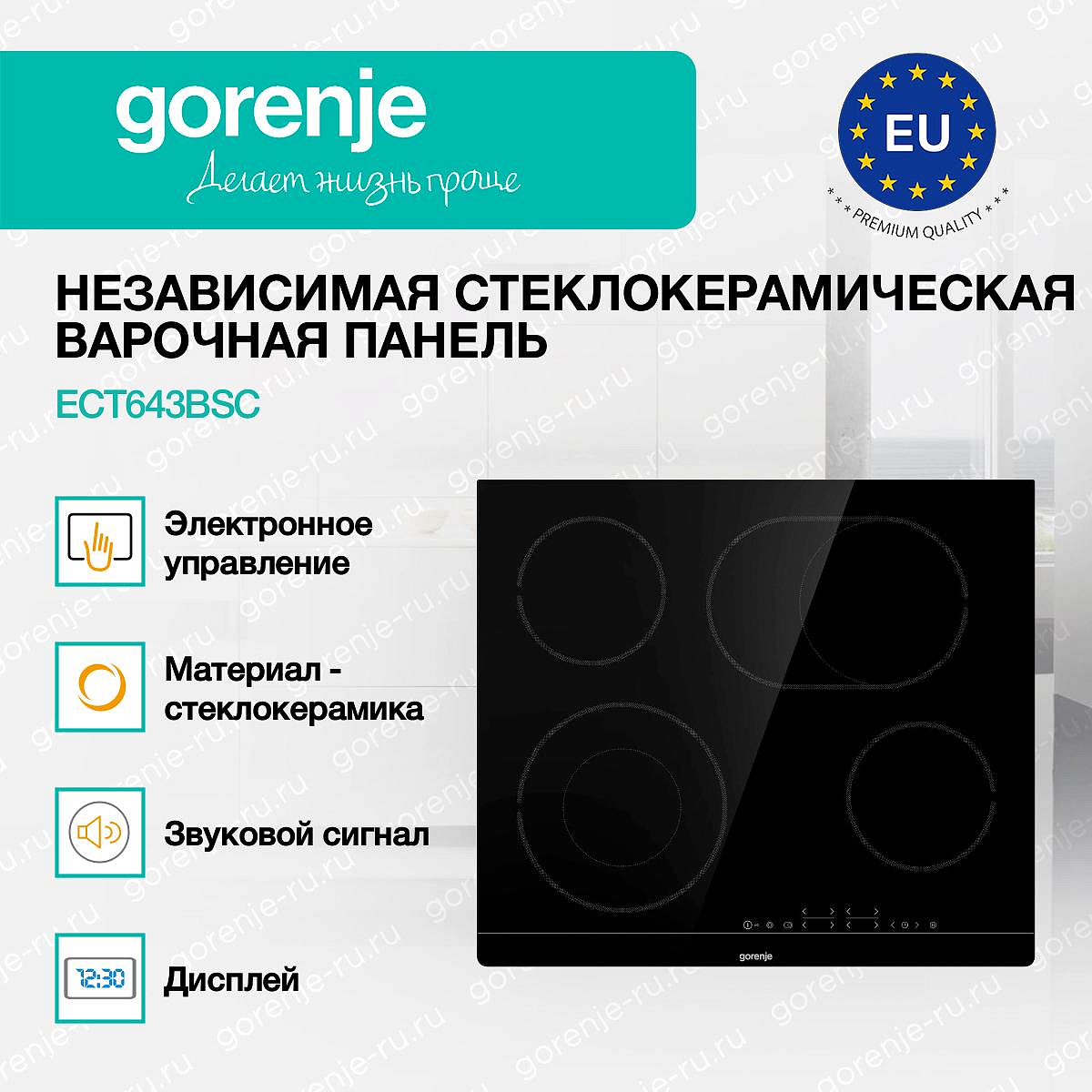 ** Все информационные материалы, представленные на Сайте, носят справочный характер и не могут в полной мере передавать достоверную информацию о свойствах, комплектации и характеристиках товара, включая цвета, размеры и формы. Фирма-производитель оставляет за собой право на внесение изменений в конструкцию, дизайн и комплектацию товара без предварительного уведомления. Перед оформлением Заказа Покупатель должен обратиться к Продавцу для уточнения свойств и характеристик Товара. Подробная информация о товаре указывается в инструкции и на упаковке товара. Используемое название в России: Горенье ECT643BSC