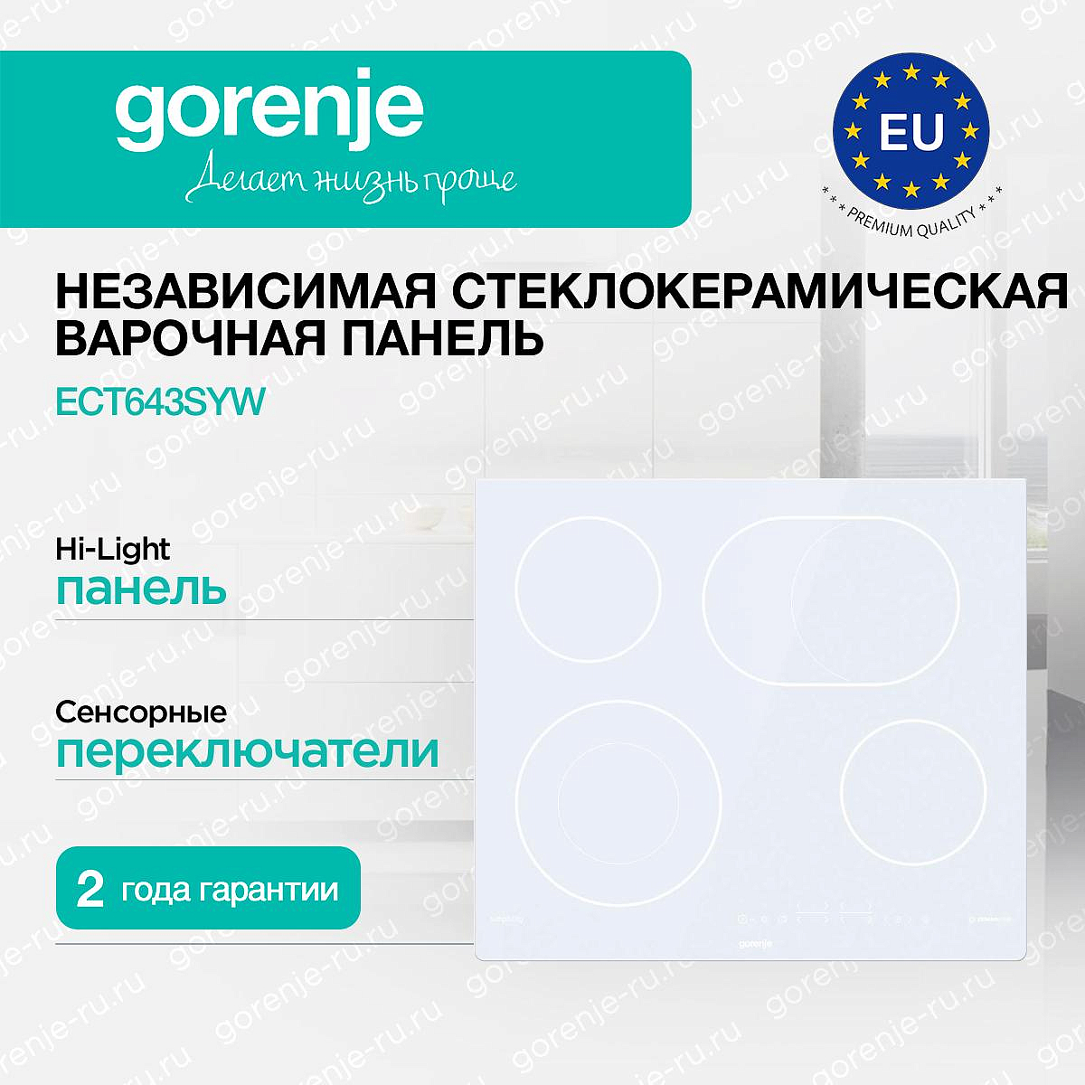 ** Все информационные материалы, представленные на Сайте, носят справочный характер и не могут в полной мере передавать достоверную информацию о свойствах, комплектации и характеристиках товара, включая цвета, размеры и формы. Фирма-производитель оставляет за собой право на внесение изменений в конструкцию, дизайн и комплектацию товара без предварительного уведомления. Перед оформлением Заказа Покупатель должен обратиться к Продавцу для уточнения свойств и характеристик Товара. Подробная информация о товаре указывается в инструкции и на упаковке товара. Используемое название в России: Горенье ECT643SYW