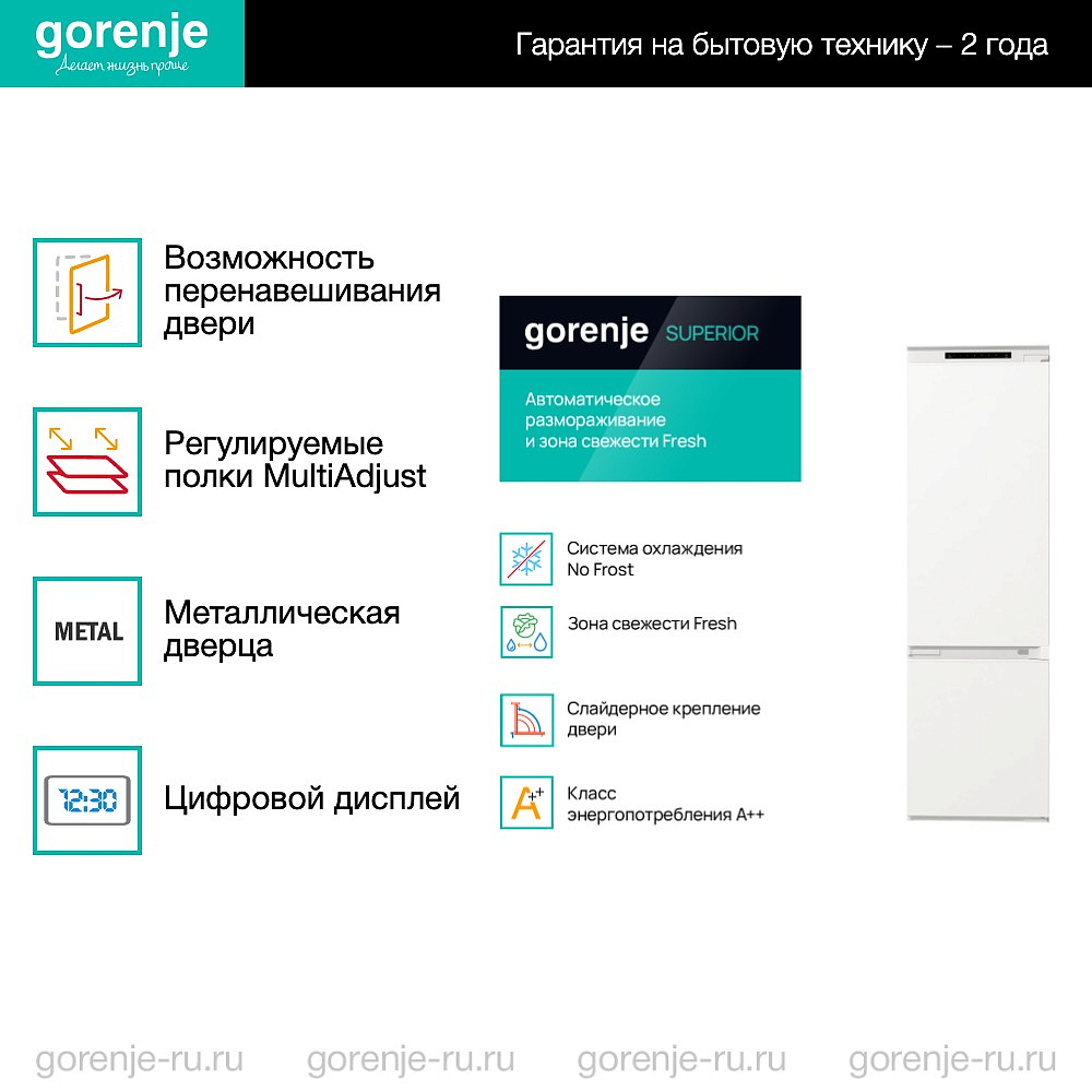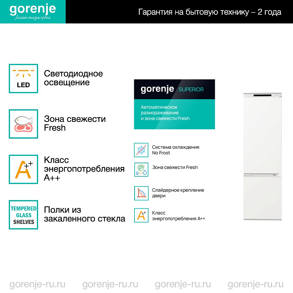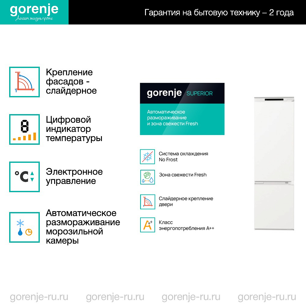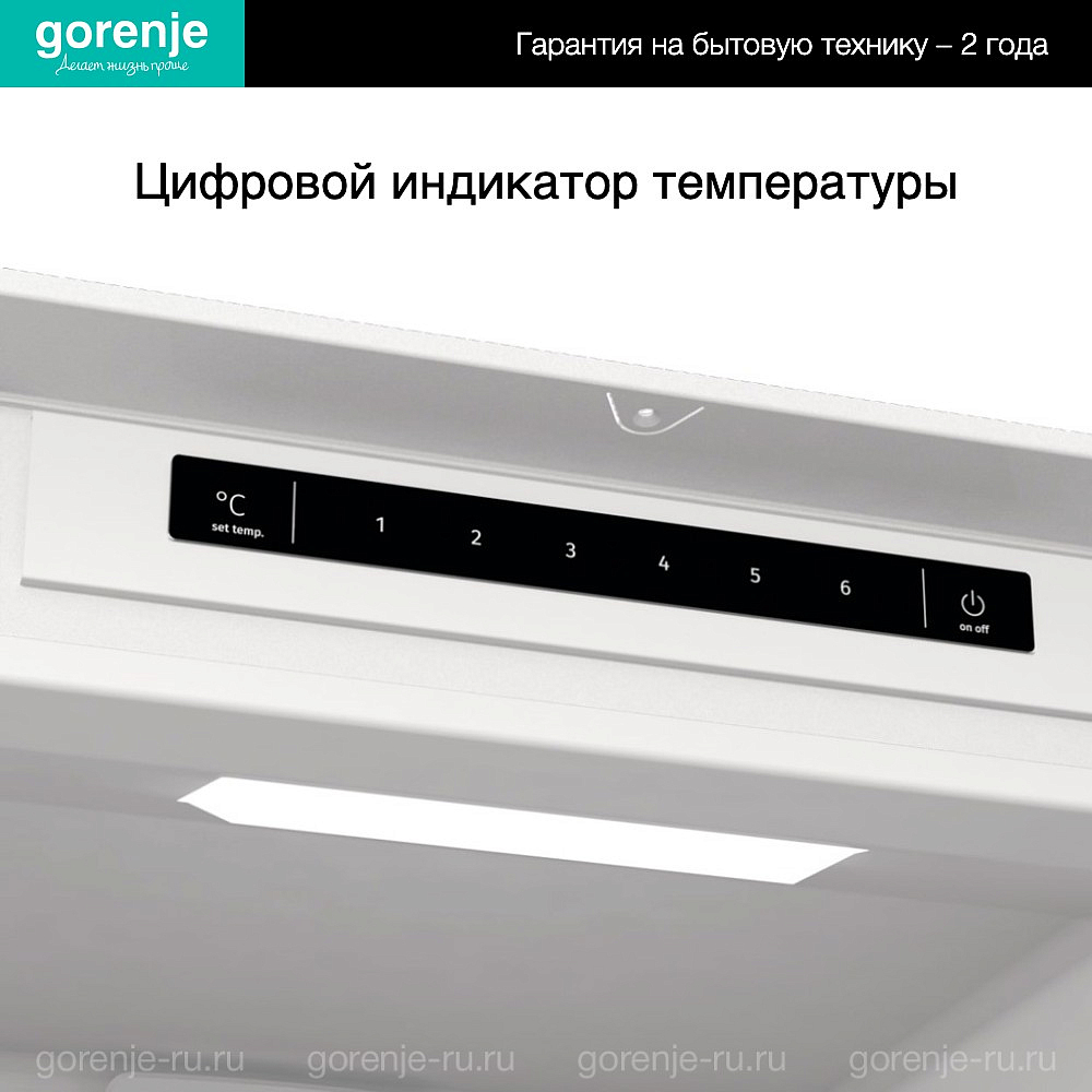 Встраиваемый двухкамерный холодильник Горенье NRKI419EP1 оснащен технологией NoFrost DualAdvance. Влажный воздух с помощью вентилятора выводится из морозильного отделения, поэтому там не намерзает лед. Размораживание и холодильной камеры, и морозилки происходит автоматически. Объем обоих отделений — 255 и 56 л соответственно. Управление моделью — электронное, всю информацию о ее работе вы увидите на цифровом дисплее. Например, устройство оборудовано индикатором температуры для холодильного отделения. А его внутреннее пространство освещено светодиодами, расположенными на потолке.