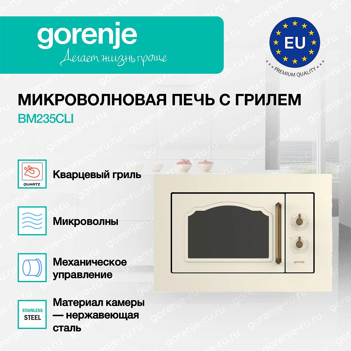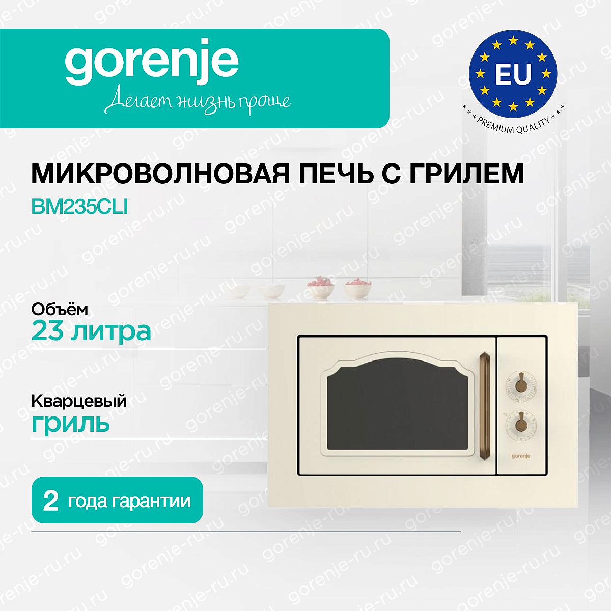 ** Все информационные материалы, представленные на Сайте, носят справочный характер и не могут в полной мере передавать достоверную информацию о свойствах, комплектации и характеристиках товара, включая цвета, размеры и формы. Фирма-производитель оставляет за собой право на внесение изменений в конструкцию, дизайн и комплектацию товара без предварительного уведомления. Перед оформлением Заказа Покупатель должен обратиться к Продавцу для уточнения свойств и характеристик Товара. Подробная информация о товаре указывается в инструкции и на упаковке товара. Используемое название в России: Горенье BM235CLI