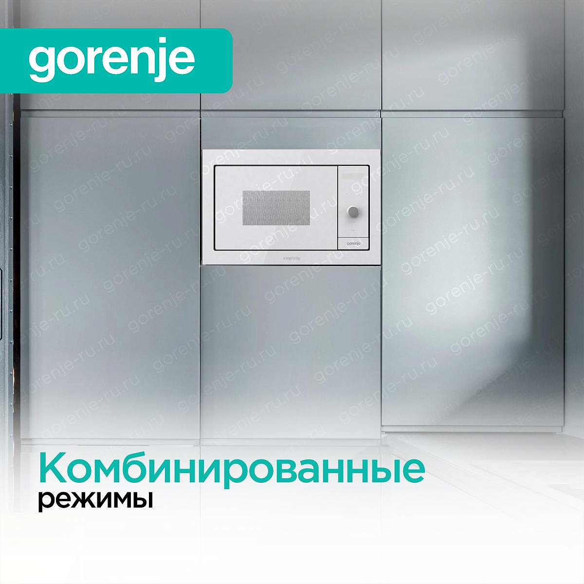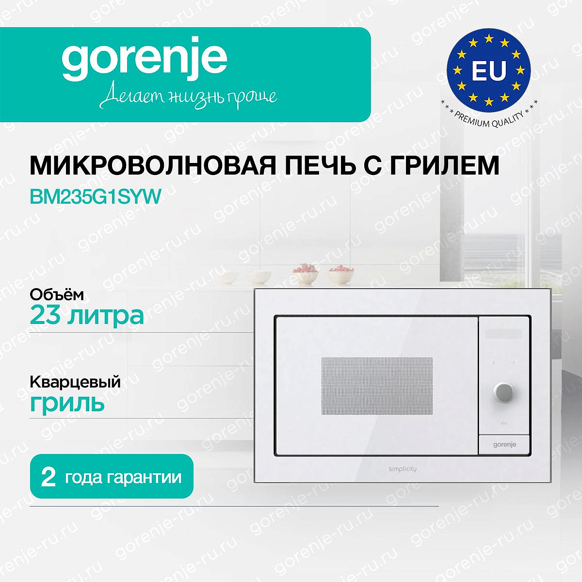 Встраиваемая микроволновая печь Gorenje BM235G1SYW — модель из линейки Simplicity. Она выполнена в белом цвете, легко впишется в интерьер кухни и не займет много места. Имеет объем 23 литра и увеличенную площадь приготовления. При этом ее можно расположить на кухонной полке или другой мебели. Ее легко содержать в чистоте. Для этого нужно набрать небольшое количество воды в любую емкость и включить функцию AutoClean. Горячий пар размягчит грязь на стенках. После этого достаточно протереть внутреннюю поверхность тряпкой.
