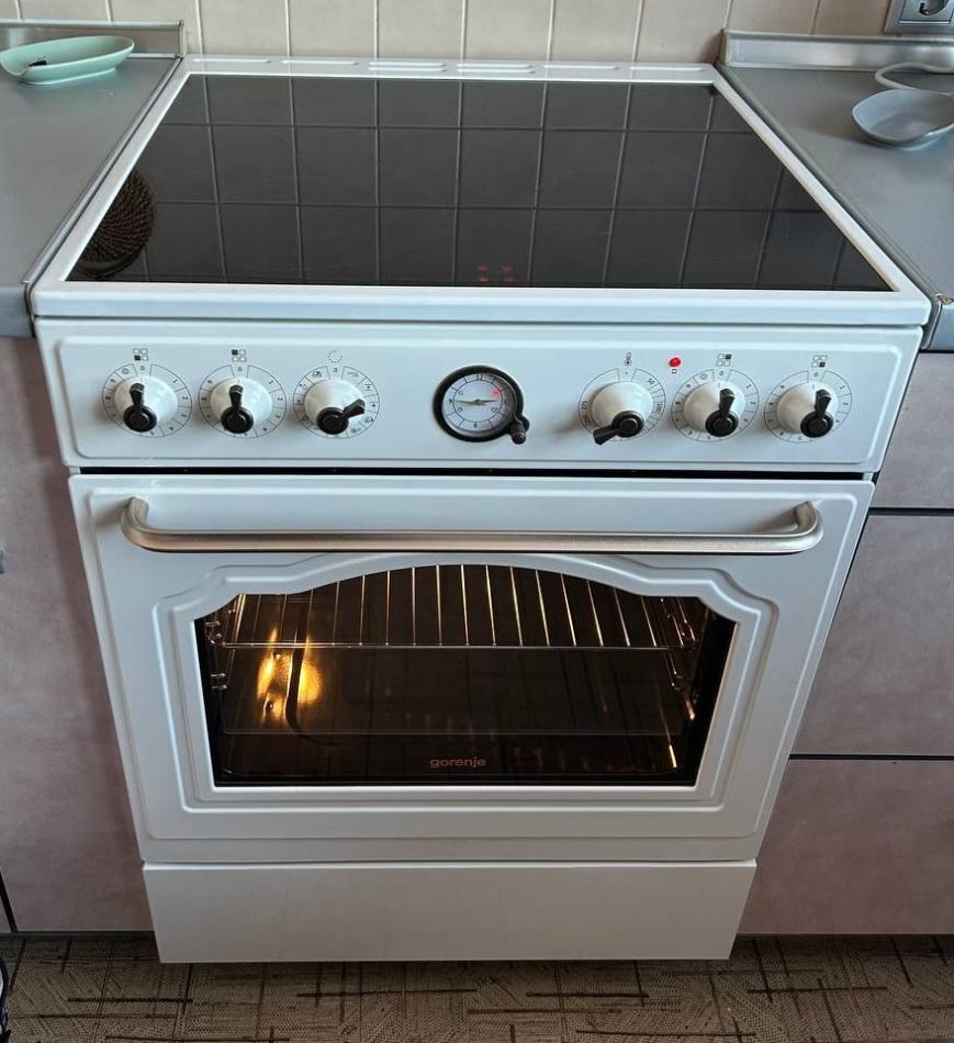 Плита Gorenje GECS5B70CLI стала настоящим украшением моей кухни! Бежевый цвет в сочетании с бронзовой фурнитурой выглядит элегантно и уютно — совершенно не похоже на стандартную бытовую технику. Стеклокерамическая поверхность не только легко моется (достаточно протереть влажной тряпкой после остывания), но и радует функцией индикации остаточного тепла: на каждой конфорке загорается символ «H», который предупреждает, что поверхность ещё горячая. Это особенно ценно, когда в доме есть дети или когда готовишь в спешке. Отдельно хочу отметить функцию ExtraSteam в духовке — с её помощью я впервые испекла хлеб с хрустящей корочкой и сочные рулеты, которые раньше никогда не удавались. Механические поворотные переключатели с эргономичной формой удобно крутить даже влажными руками, а электронный программатор с аналоговым дисплеем позволяет точно установить время приготовления без лишних сложностей. Внутренняя подсветка духовки яркая, отлично освещает блюдо в процессе готовки — больше не нужно открывать дверцу, чтобы проверить степень прожарки.