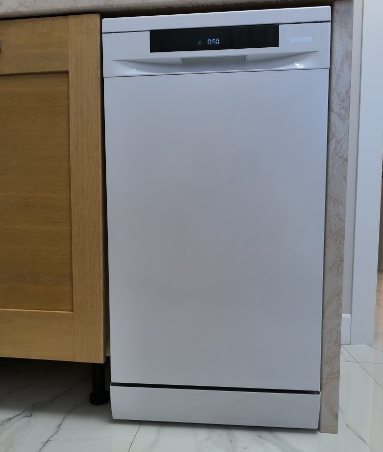 Посудомоечная машина Gorenje GS541D10W стала настоящим спасением на моей кухне. Прежде всего, впечатлила функция TotalDry — автоматическое открывание дверцы после завершения цикла. Это значительно улучшает сушку посуды: всё выходит действительно сухим, без конденсата, что особенно ценно для стеклянной посуды и бокалов. Узкий корпус идеально вписался в отведённое пространство, при этом вместимость на 11 комплектов оказалась вполне достаточной даже для гостей. Особенно удобна функция «½ загрузки» — когда мойка требуется небольшой партии посуды, я могу запустить экономичный цикл без перерасхода воды и электричества. Отсрочка старта до 24 часов — ещё один плюс: ставлю посуду вечером, задаю старт на ночное тарифное время, и утром вся посуда уже чистая и сухая. Электронное управление с кнопками и светодиодной индикацией простое и интуитивно понятное, никакого «умного» интерфейса, который ломается через полгода.