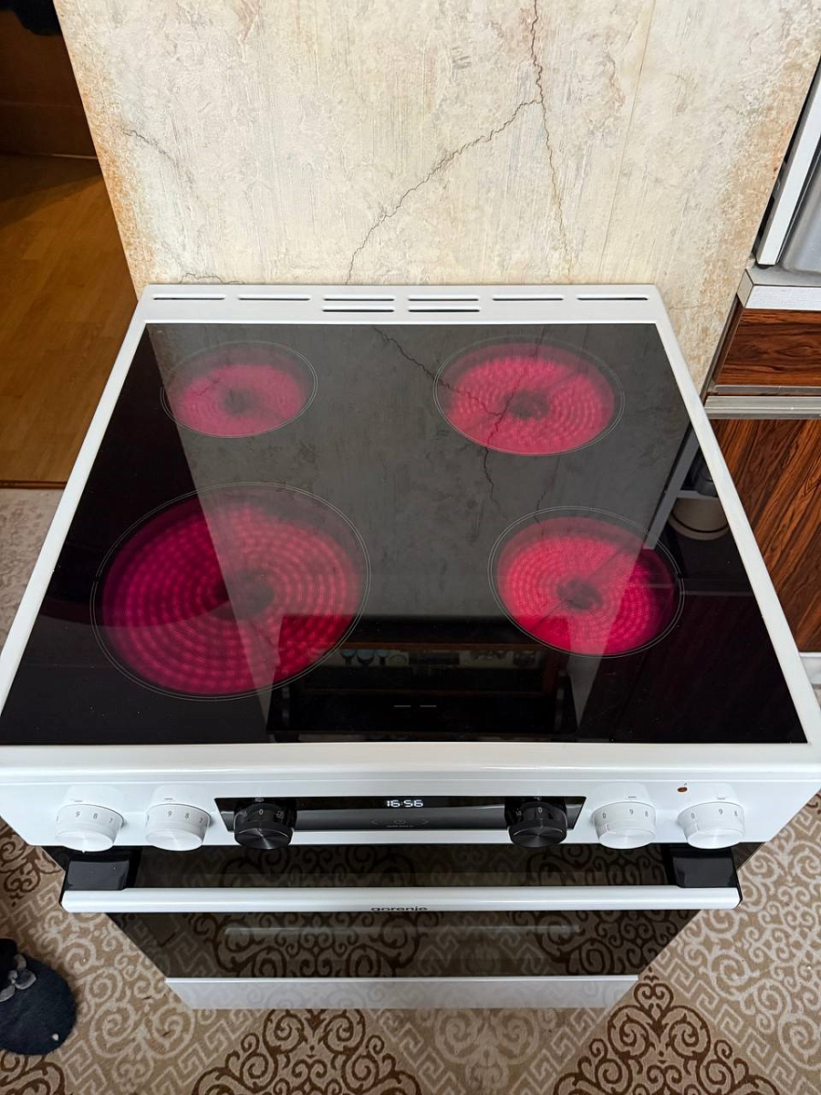 Плита Gorenje GECS5B70CLI стала настоящим украшением моей кухни! Бежевый цвет в сочетании с бронзовой фурнитурой выглядит элегантно и уютно — совершенно не похоже на стандартную бытовую технику. Стеклокерамическая поверхность не только легко моется (достаточно протереть влажной тряпкой после остывания), но и радует функцией индикации остаточного тепла: на каждой конфорке загорается символ «H», который предупреждает, что поверхность ещё горячая. Это особенно ценно, когда в доме есть дети или когда готовишь в спешке. Отдельно хочу отметить функцию ExtraSteam в духовке — с её помощью я впервые испекла хлеб с хрустящей корочкой и сочные рулеты, которые раньше никогда не удавались. Механические поворотные переключатели с эргономичной формой удобно крутить даже влажными руками, а электронный программатор с аналоговым дисплеем позволяет точно установить время приготовления без лишних сложностей. Внутренняя подсветка духовки яркая, отлично освещает блюдо в процессе готовки — больше не нужно открывать дверцу, чтобы проверить степень прожарки.