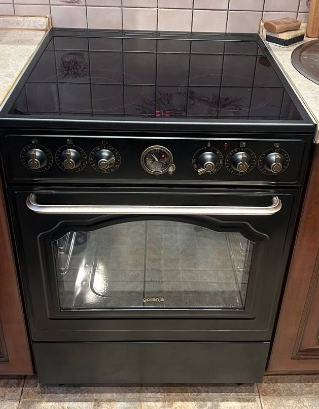 Плита Gorenje GECS6B71CLB стала настоящим украшением моей кухни — стильный черный стеклокерамический верх в сочетании с бронзовой фурнитурой выглядит очень элегантно и современно. Особенно радует удобство управления: поворотные переключатели имеют эргономичную форму, их легко крутить даже влажными руками, а электронный программатор с аналоговым дисплеем позволяет точно задавать время приготовления. Духовка прогревается быстро и равномерно, благодаря чему блюда получаются идеальными — от хрустящей корочки на пирогах до сочного мяса. Очень ценю наличие внутреннего освещения: теперь не нужно наклоняться или использовать фонарик, чтобы проверить готовность блюда. Комплектация тоже порадовала — сразу получилa всё необходимое: решетку, два противня (мелкий и глубокий), а также съемные направляющие, которые значительно упрощают уход за духовкой.