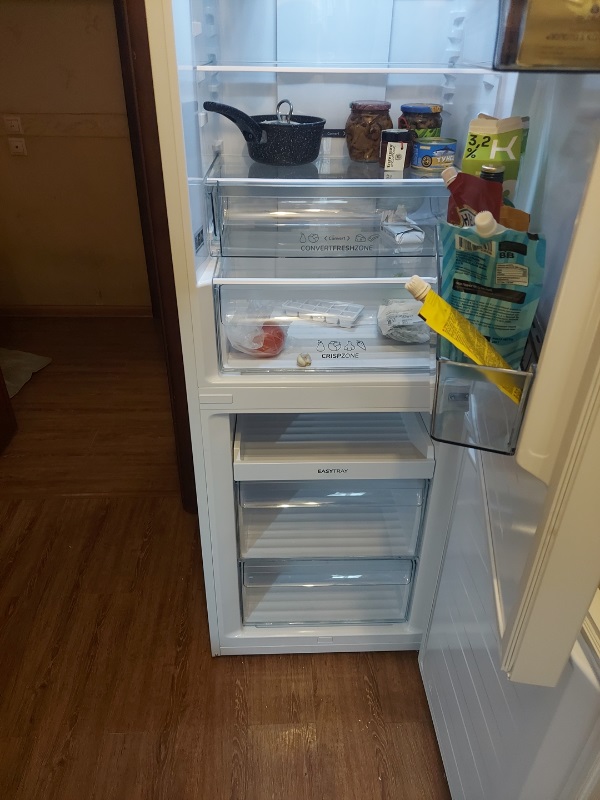 Купила этот холодильник полтора месяца назад и сразу заметила, как изменилась рутина на кухне. Ночная тишина — важный плюс для семьи: прибор работает практически неслышно, и даже во время дневного сна маленького ребёнка я не переживаю изза шума. Морозильная камера снизу оказалась удобнее, чем я думала: ящики легко достать, и в них помещаются большие пакеты с заготовками. Однажды быстро заморозила свежую рыбу перед приездом родителей — функция FastFreeze справилась, и вкус остался на уровне. No Frost Plus избавил меня от бесконечной уборки льда, это реально экономит время. Светодиодное освещение делает внутренность понятной даже вечером, а цифровой индикатор и управление за дверцей просты в обращении. IonAir и равномерная циркуляция помогли заметно дольше сохранять овощи в большом CrispZone: помидоры и ягоды не покрылись плесенью, как бывало раньше. Однажды забыли закрыть дверь — сработала звуковая и визуальная сигнализация, и это предотвратило порчу продуктов. Установка прошла без проблем, и возможность перенавесить дверь пригодилась при перестановке на кухне. Рекомендую тем, кто ценит удобство, аккуратность и надёжность в быту.